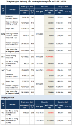 Tuần qua (22–26/12/2025), dù chỉ ghi nhận một giao dịch mua mới được công bố, hoạt động của các quỹ đầu tư cho thấy lực cầu vẫn duy trì trong...
