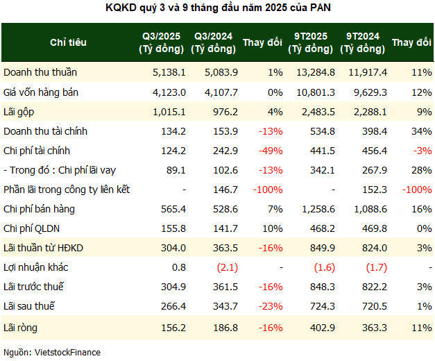 Tập đoàn PAN, doanh nghiệp trong lĩnh vực nông nghiệp, thực phẩm và thủy sản do ông Nguyễn Duy Hưng làm Chủ tịch HĐQT, ghi nhận doanh thu quý 3/2025 đạt 5,138 tỷ đồng, tăng 1% so với cùng kỳ và xác lập kỷ lục mới. Tuy nhiên, lãi ròng giảm 16% xuống còn 156 tỷ đồng, dù vẫn là quý có lãi cao nhất trong năm, tăng 44% so với quý đầu năm. Biên lãi gộp cải thiện lên 19.8% so với 19.2% cùng kỳ.