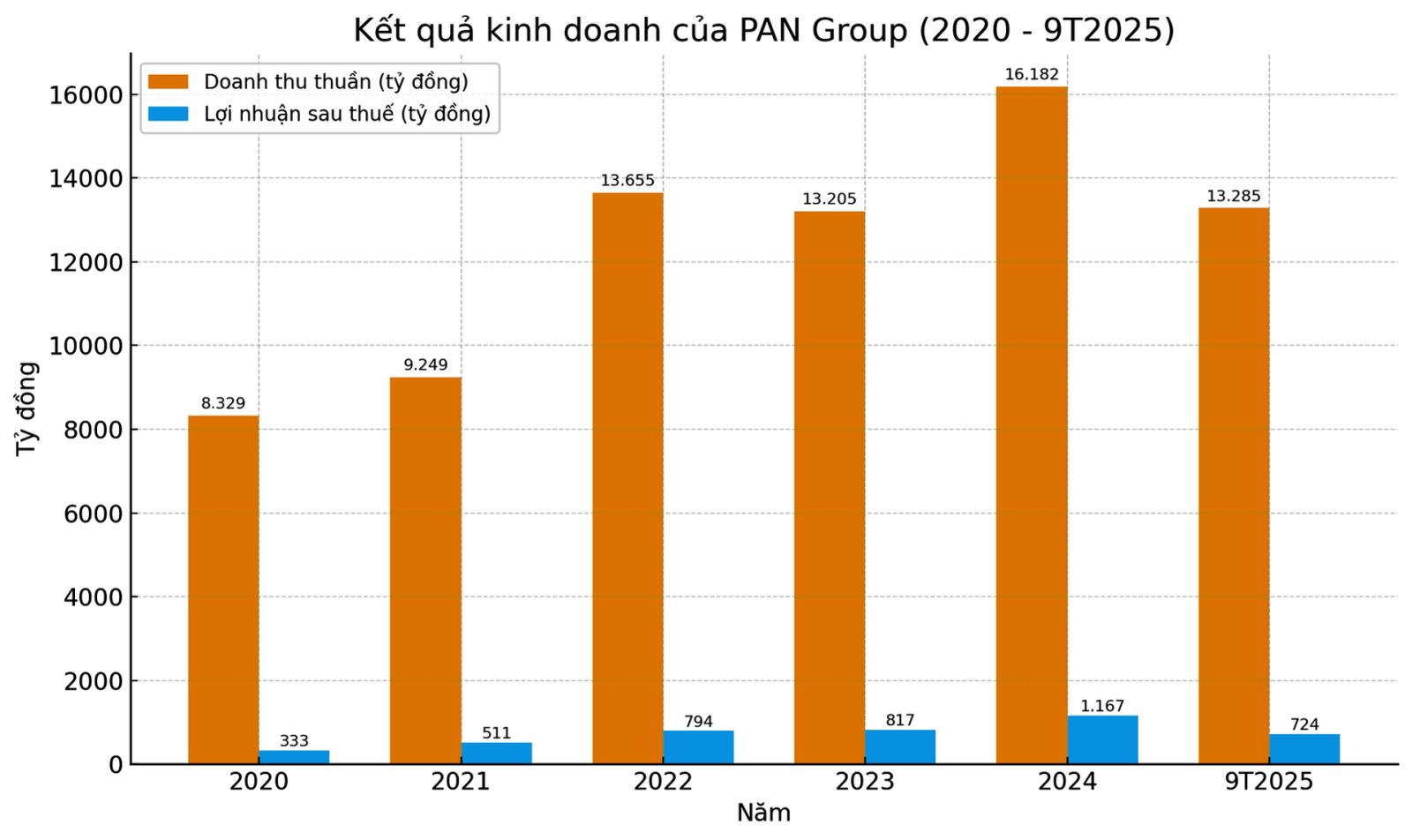 Năm 2025, PAN đặt mục tiêu doanh thu 17.256 tỷ đồng và lãi ròng 1.210 tỷ đồng. Như vậy, sau 9 tháng, công ty đã thực hiện 77% mục tiêu doanh thu và 60% mục tiêu lợi nhuận cả năm.