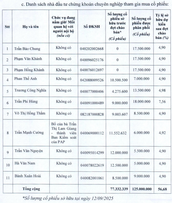 HĐQT PAP đồng thời phê duyệt danh sách 11 nhà đầu tư dự kiến mua toàn bộ 125 triệu cp. Trong đó, ông Trần Phi Hùng dự kiến mua nhiều nhất 18 triệu cp và trở thành cổ đông lớn với tỷ lệ sở hữu 7.56%, tương đương 27 triệu cp sau giao dịch. 10 nhà đầu tư còn lại đều không vượt ngưỡng 5% vốn.