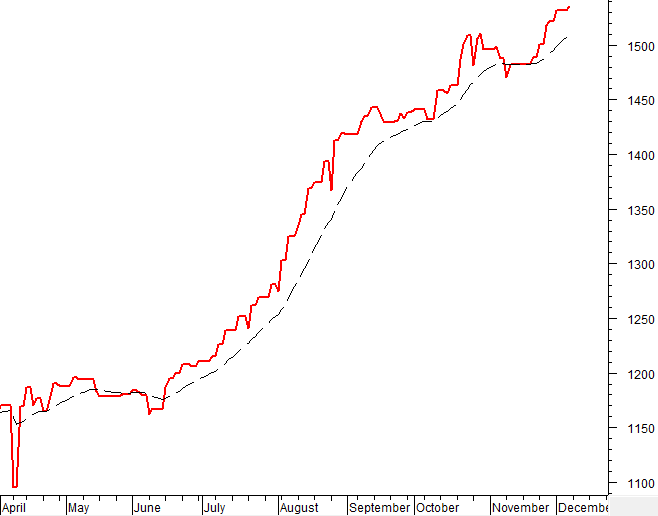 Biến động của dòng tiền thông minh: Chỉ báo Negative Volume Index của VN-Index đang nằm trên đường EMA 20 ngày. Nếu trạng thái này tiếp tục trong phiên tới thì rủi ro sụt giảm bất ngờ (thrust down) sẽ giảm bớt.