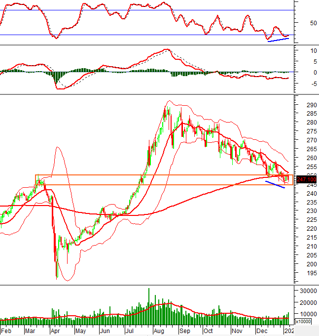 Mặt khác, chỉ báo Stochastic Oscillator đã hình thành phân kỳ tăng giá (Bullish Divergence) và đang cho tín hiệu mua ở vùng quá bán (Oversold). Nếu chỉ báo tiếp tục tăng và vượt lên khỏi vùng này trong các phiên tới thì khả năng phục hồi ngắn hạn sẽ xuất hiện.