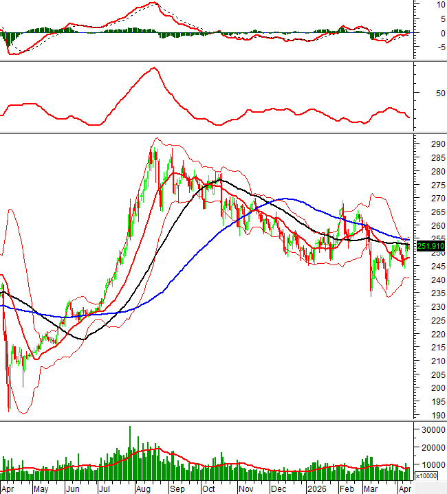 Hiện tại, chỉ số vẫn bám sát dải trên (Upper Band) của Bollinger Bands trong khi chỉ báo MACD tiếp tục tăng và tiến về gần mức 0 sau khi cho tín hiệu mua.
