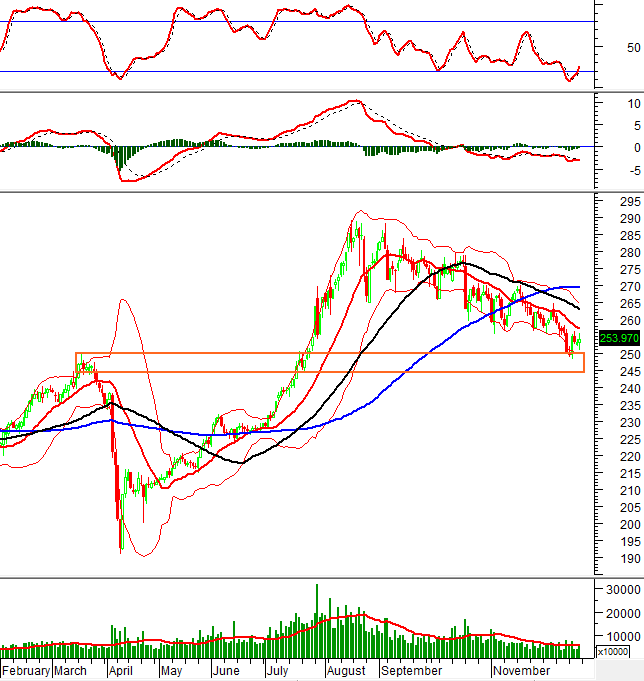 Hiện tại, chỉ số tiếp tục diễn biến giằng co với các phiên tăng giảm đan xen và đang kiểm tra lại đỉnh cũ đã bị phá vỡ trước đó vào 03/2025 (tương đương vùng 243-250 điểm) và tiếp tục nằm dưới đường Middle của Bollinger Bands cho thấy triển vọng ngắn hạn vẫn chưa có sự cải thiện rõ ràng.