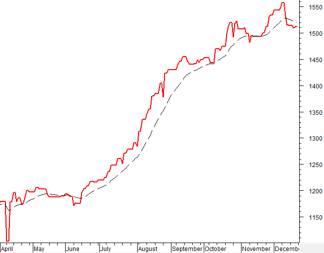 Biến động của dòng tiền thông minh: Chỉ báo Negative Volume Index của VN-Index đang nằm bên dưới đường EMA 20 ngày. Nếu trạng thái này tiếp tục trong phiên tới thì rủi ro sụt giảm bất ngờ (thrust down) sẽ tăng cao.