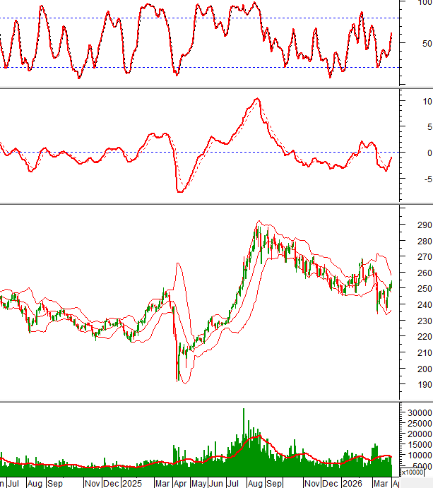 Bên cạnh đó, giá cổ phiếu nằm trên đường Middle và chỉ báo Stochastic Oscillator vẫn cho tín hiệu mua.