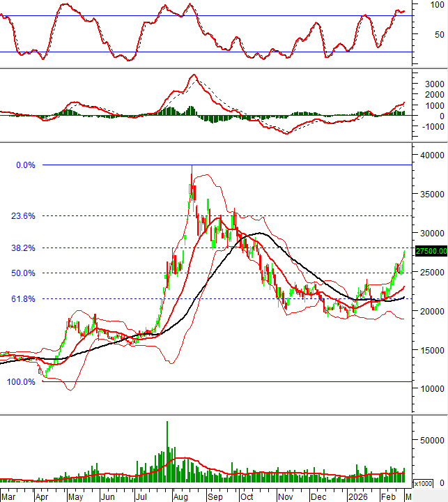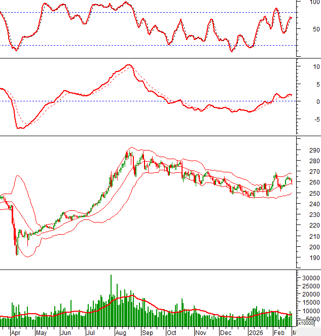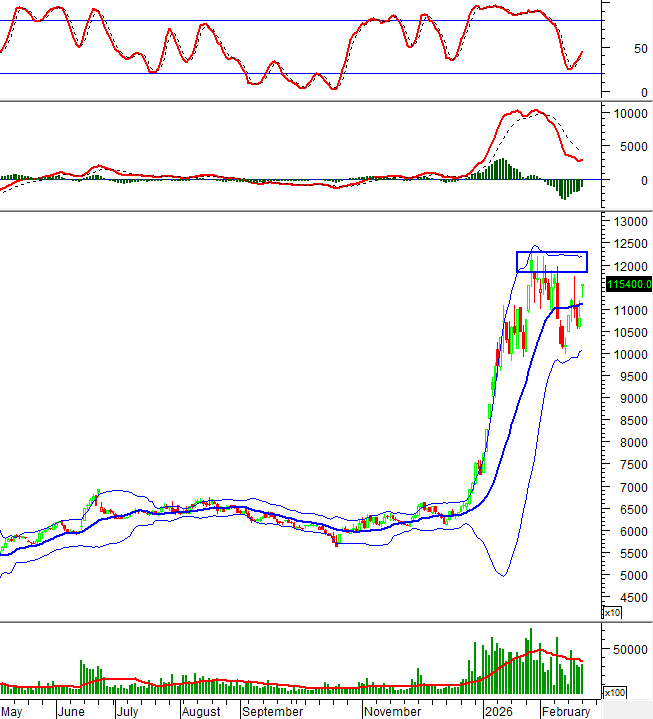 Hiện cổ phiếu này đang tiến về gần đỉnh cũ tháng 01/2026 (tương đương vùng 118,000-122,800) trong khi chỉ báo Stochastic Oscillator tiếp tục tăng sau khi cho tín hiệu mua.