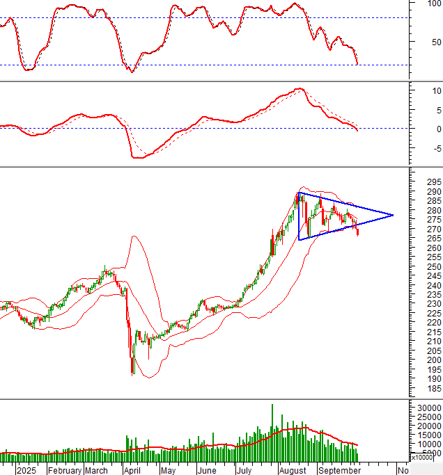 Trong phiên giao dịch sáng ngày 03/10/2025, mẫu hình Triangle đã hình thành và có mục tiêu giá xuống đến vùng 245-250 điểm.