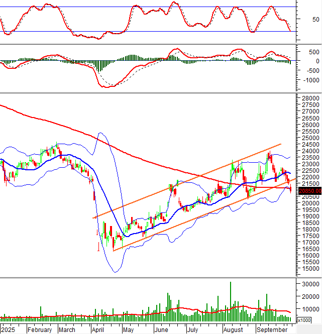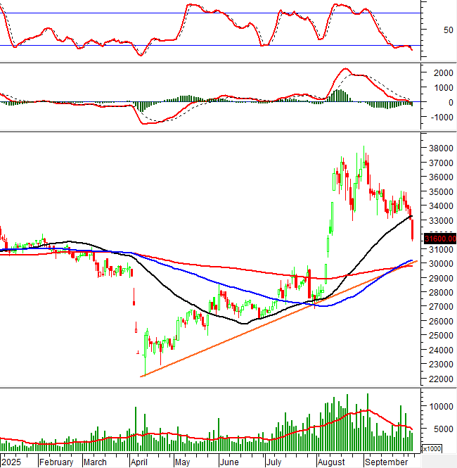 Trong phiên giao dịch sáng ngày 03/10/2025, giá cổ phiếu PVD đã phá cạnh dưới của kênh giá tăng (Bullish Price Channel) trung hạn và tiếp tục giảm phiên thứ 4 liên tiếp cho thấy tâm lý bi quan của nhà đầu tư.