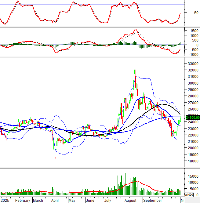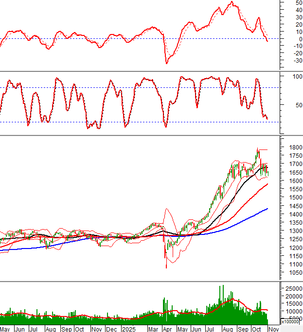 Trong phiên giao dịch sáng ngày 03/11/2025, giá cổ phiếu PC1 tăng và tiếp tục nằm trên đường Middle của Bollinger Bands kèm theo khối lượng dự kiến vượt mức trung bình 20 ngày khi kết thúc phiên cho thấy tâm lý khá lạc quan của nhà đầu tư.