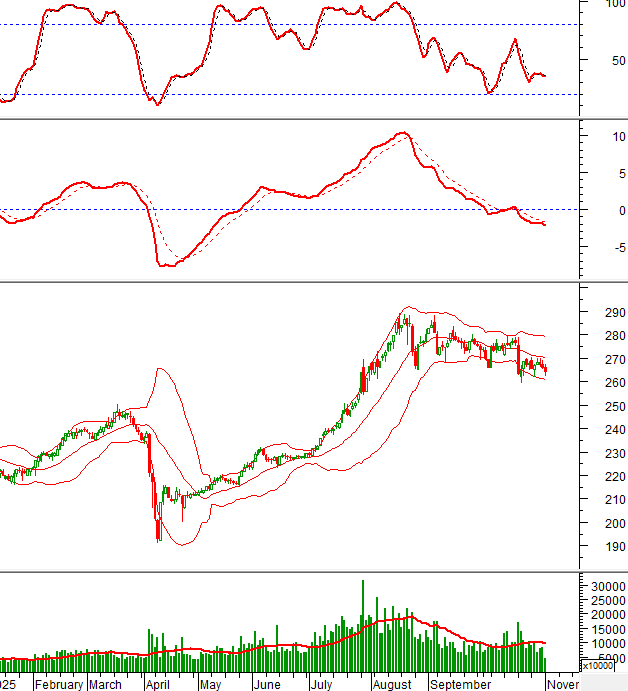 Trong phiên giao dịch sáng ngày 03/11/2025, HNX-Index tiếp tục đi xuống sau khi chỉ báo Stochastic Oscillator cho tín hiệu bán.