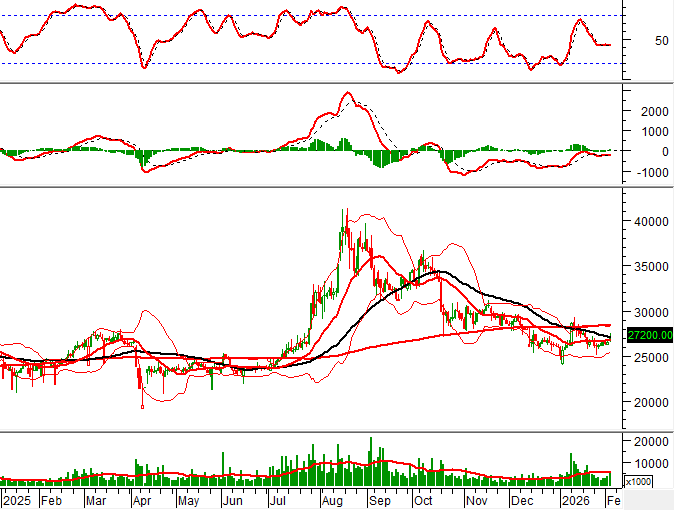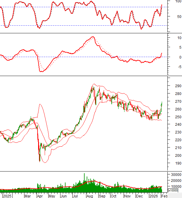 Trong phiên giao dịch sáng ngày 04/02/2026, HNX-Index bám vào Upper Band của Bollinger Bands và tiếp tục tăng trưởng.