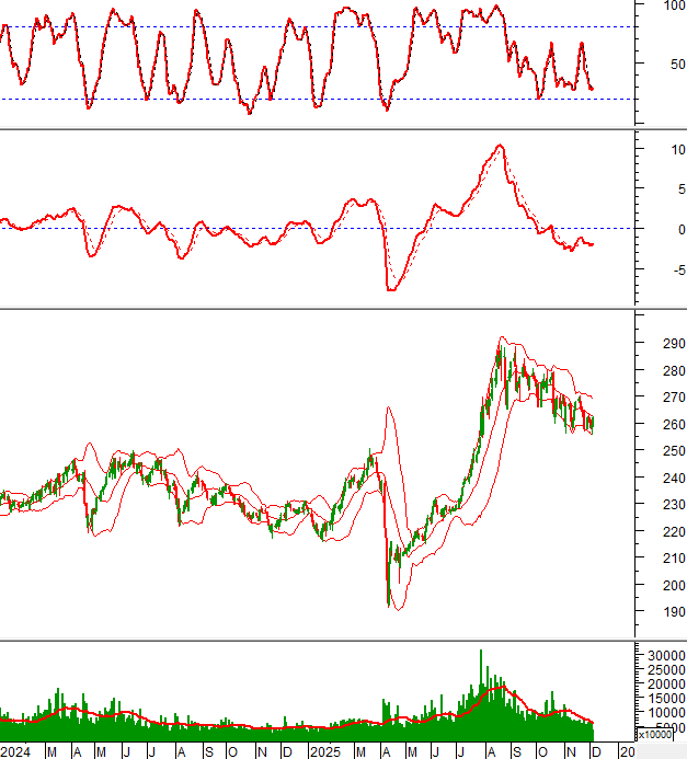 VN-Index tạm chững lại đà tăng nhưng vẫn nằm sát Upper Band của Bollinger Bands và MACD tiếp tục đi lên. Trong khi đó, HNX-Index hồi phục trở lại sau khi test đáy cũ tháng 11/2025 (tương đương vùng 255-259 điểm).