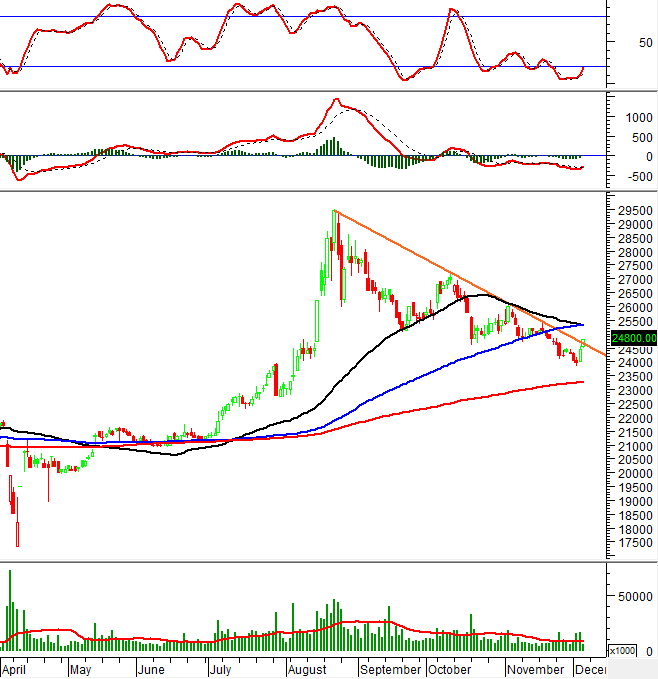 Bên cạnh đó, giá của ACB đang kiểm tra lại đường xu hướng giảm trung hạn trong bối cảnh MACD đã cho tín hiệu mua trở lại và vẫn nằm dưới mức 0. Điều này cho thấy nhịp hồi phục ngắn hạn của ACB sẽ còn gặp nhiều thử thách trong thời gian tới.