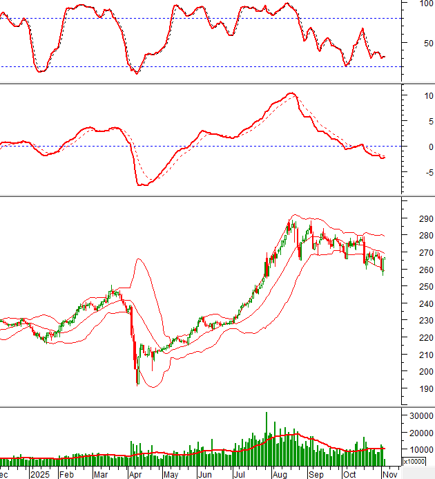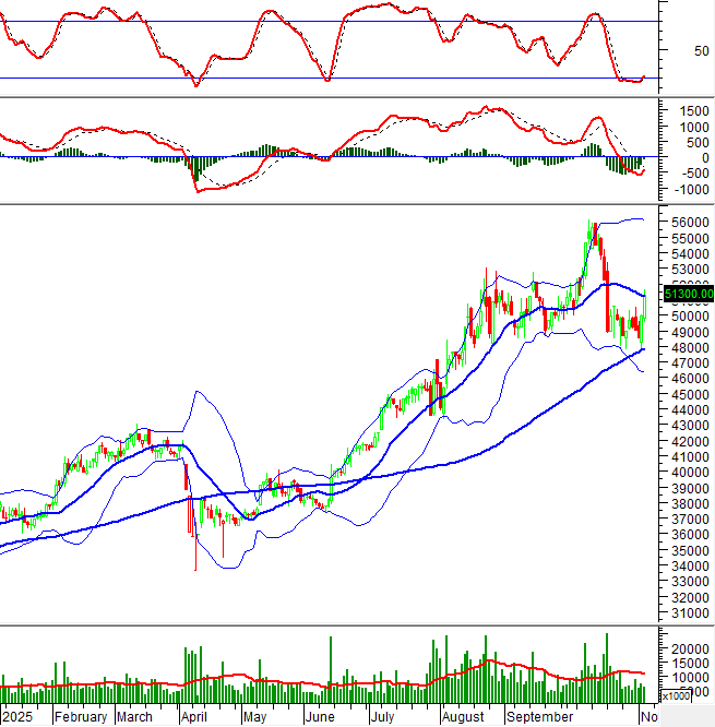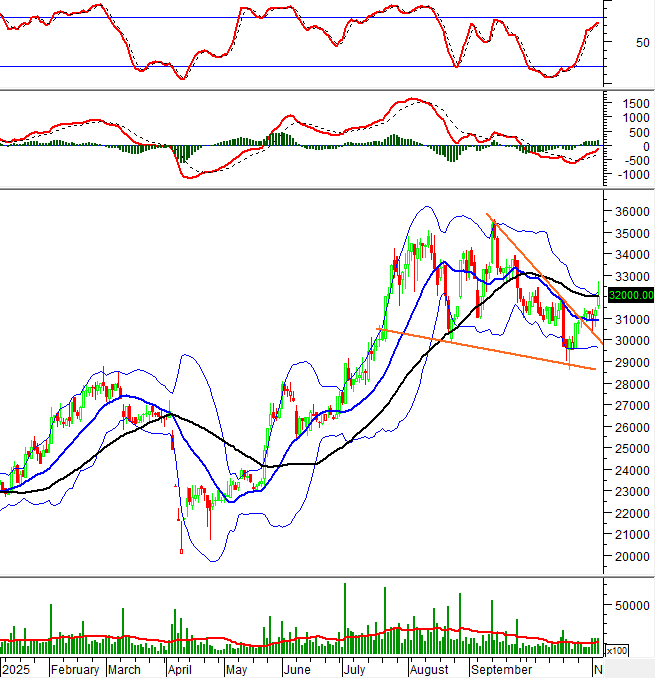 Trong phiên giao dịch sáng ngày 05/11/2025, giá cổ phiếu CTG tiếp tục tăng và đang kiểm tra lại đường Middle của Bollinger Bands cùng khối lượng giao dịch có sự gia tăng trong phiên sáng cho thấy tâm lý nhà đầu tư đã bớt bi quan.
