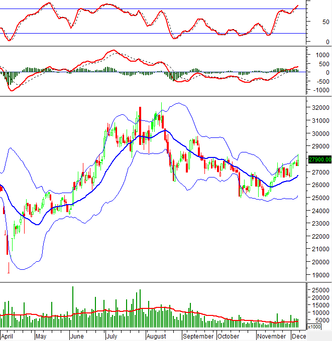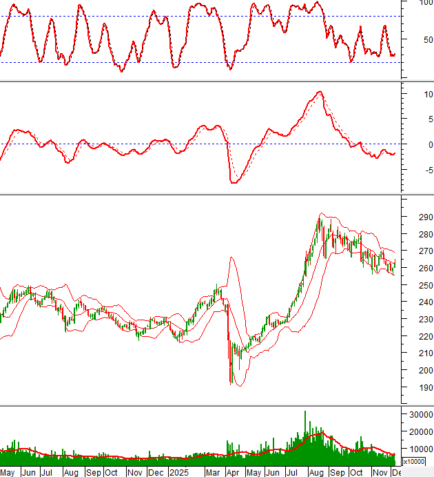 Trong phiên giao dịch sáng ngày 05/12/2025, HNX-Index lại điều chỉnh nhẹ khi test lại đường Middle của Bollinger Bands.