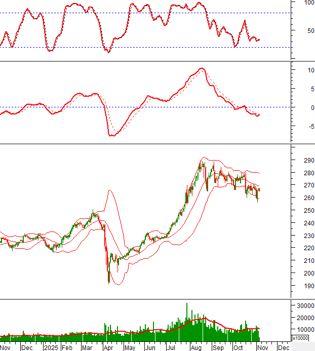 Hiện tại, giá cổ phiếu này vẫn được hỗ trợ khá tốt bởi đường Middle của Bollinger Bands trong bối cảnh chỉ báo MACD tiếp tục tăng và đang tiến về gần mức 0 sau khi cho tín hiệu mua. Điều này cho thấy triển vọng phục hồi trong ngắn hạn đang được ủng hộ.