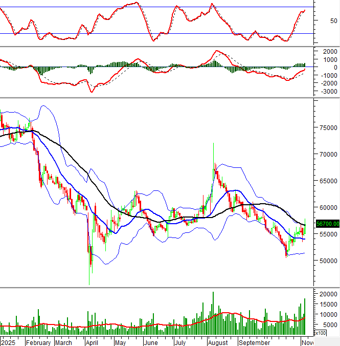 Trong phiên giao dịch sáng ngày 06/11/2025, giá cổ phiếu ACV tiếp tục tăng đồng thời xuất hiện mẫu hình nến Big White Candle kèm theo khối lượng giao dịch có sự gia tăng và vượt mức trung bình 20 phiên cho thấy nhà đầu tư đã giao dịch sôi động hơn.