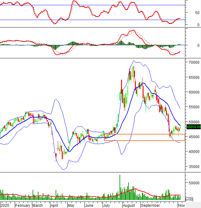 Hiện tại, khối lượng giao dịch trong các phiên gần đây liên tục nằm dưới mức trung bình 20 phiên sau khi giá cổ phiếu điều chỉnh giảm về đáy cũ tháng 07/2025 (tương đương vùng 43,400-45,700). Nếu các tín hiệu kỹ thuật tiếp tục được cải thiện thì xu hướng hồi phục ngắn hạn của VGC sẽ bền vững hơn.