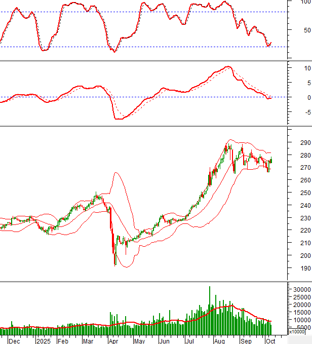 Trong phiên giao dịch sáng ngày 08/10/2025, HNX-Index tiếp tục dao động quanh đường Middle của Bollinger Bands.