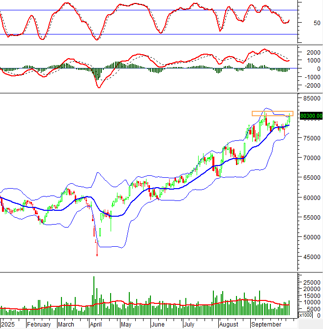 Giá của MWG đang kiểm tra lại đỉnh cũ tháng 09/2025 (tương đương vùng 80,400-81,600) trong khi chỉ báo MACD tiếp tục thu hẹp khoảng cách với đường Signal. Nếu chỉ báo xuất hiện tín hiệu mua và giá cổ phiếu vượt thành công vùng này trong các phiên tới thì đà tăng sẽ được ủng hộ thêm.