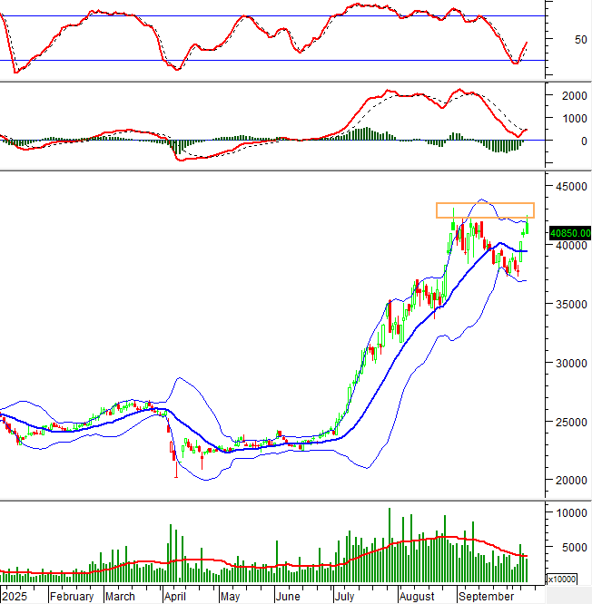 Trong phiên giao dịch sáng ngày 08/10/2025, giá cổ phiếu SSI tăng và đang kiểm tra lại đỉnh cũ tháng 08/2025 (tương đương vùng 42,200-43,500) kèm theo khối lượng dự kiến sẽ vượt mức trung bình khi kết thúc phiên cho thấy nhà đầu tư đang giao dịch sôi động.
