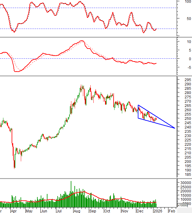 Trong phiên giao dịch sáng ngày 09/01/2026, HNX-Index điều chỉnh nhẹ khi đến gần cạnh trên của mẫu hình Falling Wedge.