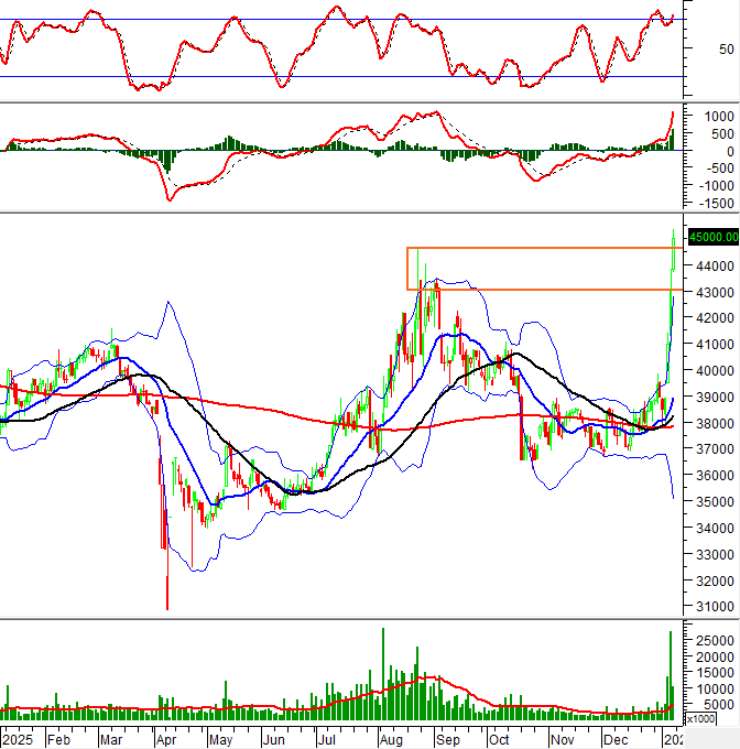 Hiện tại, giá của BID đã vượt lên khỏi neckline (tương đương vùng 43,000-44,600) của mẫu hình Rounding Bottom. Nếu đà tăng vẫn được duy trì thì mục tiêu giá tiềm năng trong dài hạn là vùng 52,500-53,500.