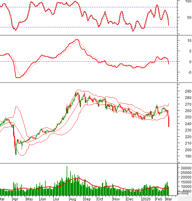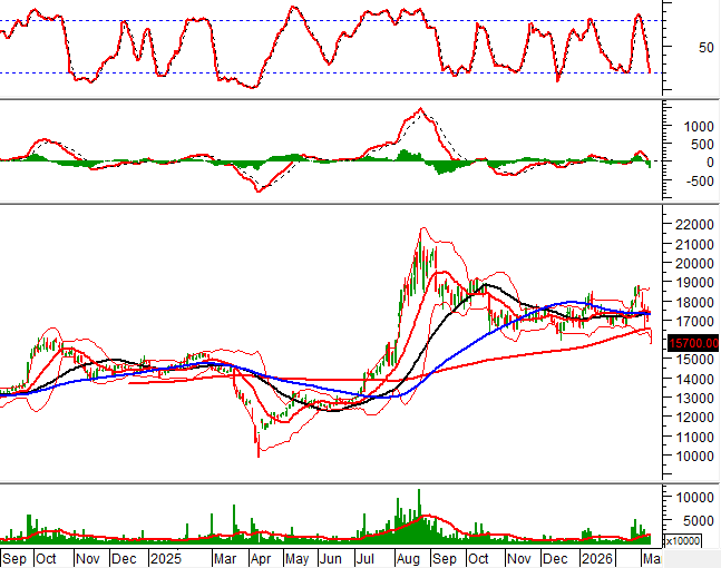 Trong phiên giao dịch sáng ngày 09/03/2026, HNX-Index cũng giảm rất mạnh và đang bám vào Lower Band của Bollinger Bands.