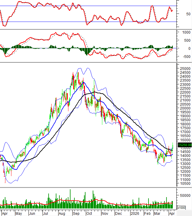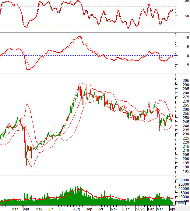 Trong phiên giao dịch sáng ngày 09/04/2026, HNX-Index cũng rung lắc nhưng vẫn nằm trên đường Middle của Bollinger Bands.