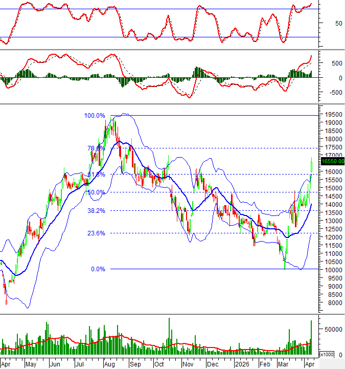 Tuy nhiên, giá đang tiến về gần ngưỡng Fibonacci Retracement 78.6% (tương đương vùng 17,100-17,500) trong khi chỉ báo Stochastic Oscillator đã tiến sâu vào vùng quá mua (overbought). Nếu tín hiệu bán xuất hiện trở lại và chỉ báo rơi khỏi vùng này trong thời gian tới thì rủi ro điều chỉnh sẽ tăng cao.