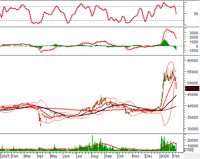 Hiện tại giá của cổ phiếu này đã phá vỡ xuống dưới (Breakdown) neckline (tương đương vùng 49,500-50,500) của mẫu hình Double Top. Nếu tình hình không có sự cải thiện và nhịp điều chỉnh ngắn hạn tiếp diễn thì mục tiêu giá (Price target) tiềm năng sẽ là vùng 42,200-44,200.