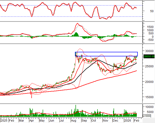 Hiện tại MBB đang kiểm tra đỉnh cũ tháng 08/2025 (tương đương vùng 28,100-29,500) trong khi giao cắt vàng (Golden Cross) giữa đường SMA 50 ngày và SMA 100 ngày đã hình thành càng củng cố thêm cho triển vọng trung hạn.