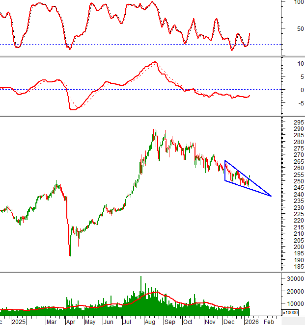 Trong phiên giao dịch sáng ngày 13/01/2026, HNX-Index tăng trưởng tốt và vượt cạnh trên của mẫu hình Falling Wedge.