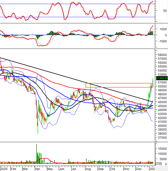 Hiện tại, giá của PTB vượt lên trên neckline (tương đương vùng 49,600-50,700) của mẫu hình Rounding Bottom trong bối cảnh xuất hiện giao cắt vàng (Golden Cross) giữa đường trung bình SMA 50 ngày với SMA 100 ngày và SMA 200 ngày.