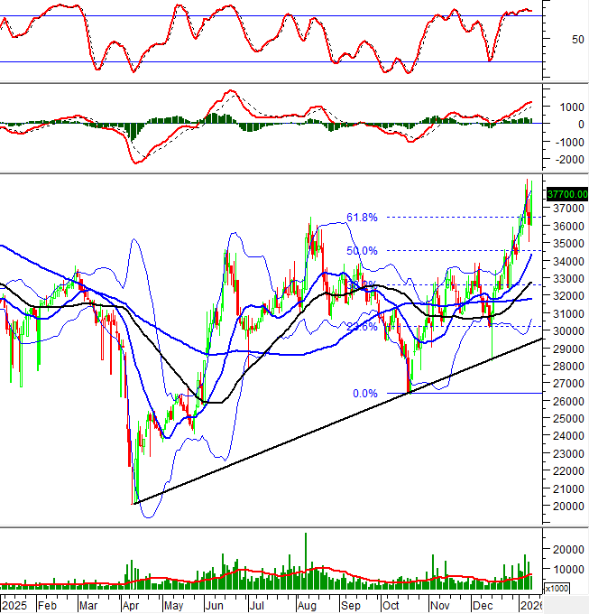 Hiện tại, PVS đang được hỗ trợ khá tốt bởi ngưỡng Fibonacci Projection 61.8% (tương đương vùng 35,600-37,100), đây đồng thời là đỉnh cũ tháng 08/2025 đã bị phá vỡ.