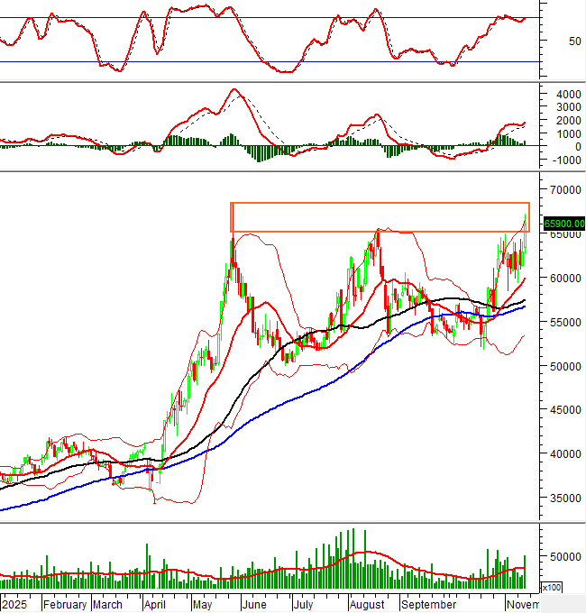 Giá của HAH đang kiểm tra lại đỉnh cũ tháng 05/2025 (tương đương vùng 65,000-68,300). Nếu đà tăng tiếp tục duy trì và bứt phá khỏi vùng này thì xu hướng tăng dài hạn sẽ được củng cố thêm.