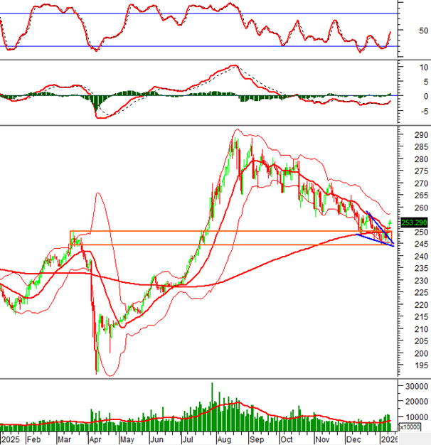 Trong phiên giao dịch sáng ngày 14/01/2026, HNX-Index tăng trưởng tốt và tiếp tục nằm ở cạnh trên của mẫu hình Falling Wedge.