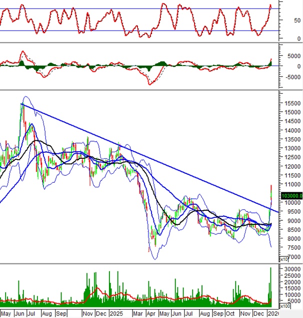 Hiện tại, giá của CTR tiếp tục tăng và bám sát dải trên (Upper Band) sau khi phá vỡ (Breakout) thành công trendline giảm dài hạn.