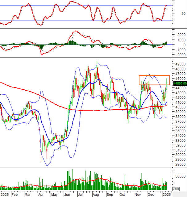 Hiện tại, giá của DGW đang kiểm tra lại đỉnh cũ tháng 11/2025 (tương đương vùng 44,500-46,500) trong bối cảnh chỉ báo Stochastic Oscillator đã tiến vào vùng quá mua (Overbought). Nếu tín hiệu bán xuất hiện trở lại và chỉ báo rơi khỏi vùng này trong các phiên tới thì rủi ro ngắn hạn sẽ tăng cao.