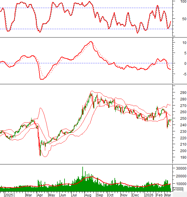Khối lượng thường xuyên nằm dưới mức trung bình 20 ngày nên sẽ khó có đột biến lớn xảy ra. Chỉ số đang nằm dưới đường Middle của Bollinger Bands nên ngưỡng này sẽ đóng vai trò kháng cự trong các phiên tới.