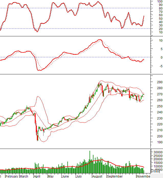 VN-Index tiếp tục đi lên phiên thứ ba liên tiếp và đã phá vỡ hoàn toàn đường Middle của Bollinger Bands. Ngưỡng này sẽ đóng vai trò hỗ trợ trong thời gian tới. Trong khi đó, HNX-Index tạm chững lại đà tăng với mẫu hình Inverted Hammer.