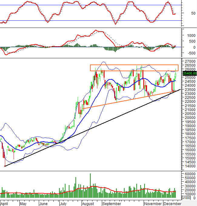 Hiện tại, giá của HDB đang kiểm tra lại đỉnh cũ tháng 10/2025 (tương đương vùng 25,700-26,500) trong khi chỉ báo MACD đã cho tín hiệu mua trở lại và đang nằm trên mức 0 càng ủng hộ thêm cho đà tăng trong ngắn hạn.