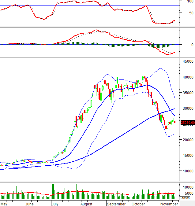 Khối lượng giao dịch nằm dưới trung bình 20 ngày từ 05/11/2025 đến nay nên chỉ số sẽ khó có đột biến. Đường Middle của Bollinger Bands đang đóng vai trò hỗ trợ ngắn hạn.