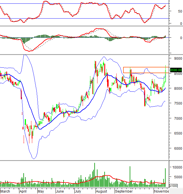 Hiện tại, giá của AAA đang kiểm tra lại đỉnh cũ tháng 9/2025 (tương đương vùng 8,500-8,700) trong khi chỉ báo MACD tiếp tục tạo các đỉnh và đáy mới cao hơn (Higher High, Higher Low) cho tín hiệu mua. Nếu các tín hiệu kỹ thuật tiếp tục tích cực thì đà tăng ngắn hạn sẽ được ủng hộ thêm.