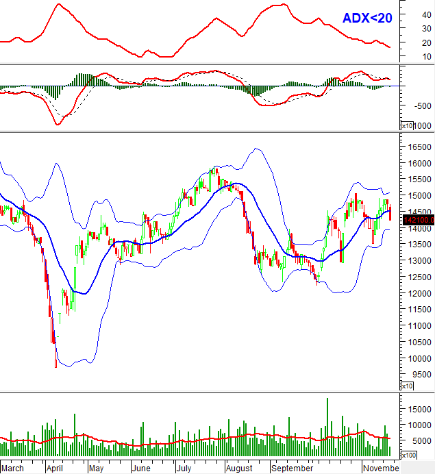 Tuy nhiên, dải Bollinger Bands tiếp tục thu hẹp khoảng cách trong khi chỉ báo ADX tiếp tục suy yếu và nằm dưới vùng xám (20<ADX<25) cho thấy xu hướng hiện tại đang rất yếu.