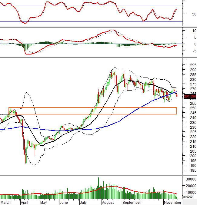 Trong phiên giao dịch sáng ngày 21/11/2025, VN-Index giảm điểm và đã cắt xuống dưới đường Middle của Bollinger Bands.