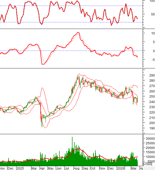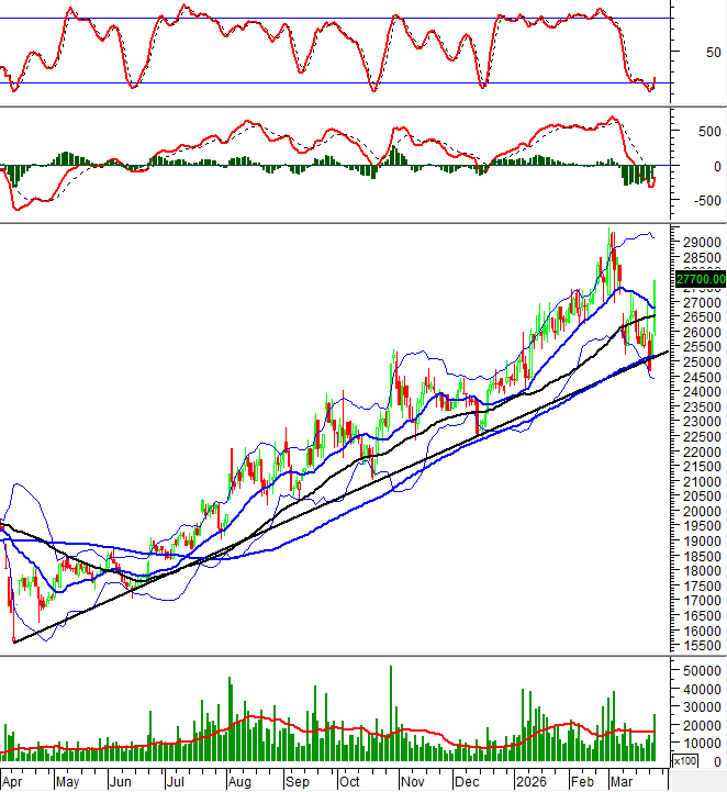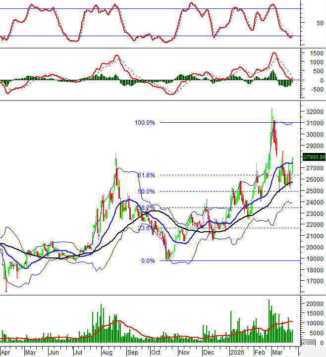 Trong phiên giao dịch sáng ngày 25/03/2026, HNX-Index cũng tăng trưởng tốt và tiến gần đến đường Middle của Bollinger Bands.