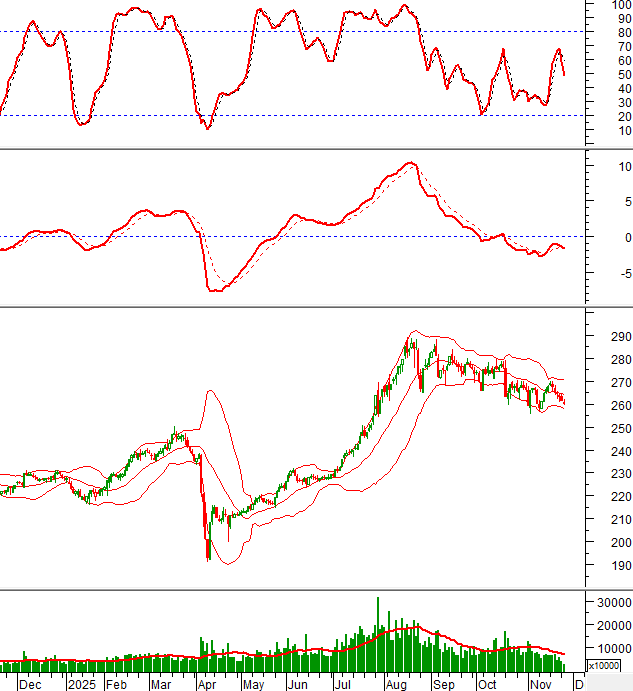 Trong phiên giao dịch sáng ngày 25/11/2025, HNX-Index bước sang phiên giảm điểm thứ 6 liên tiếp và hiện đang nằm dưới Middle của Bollinger Bands.