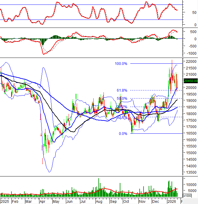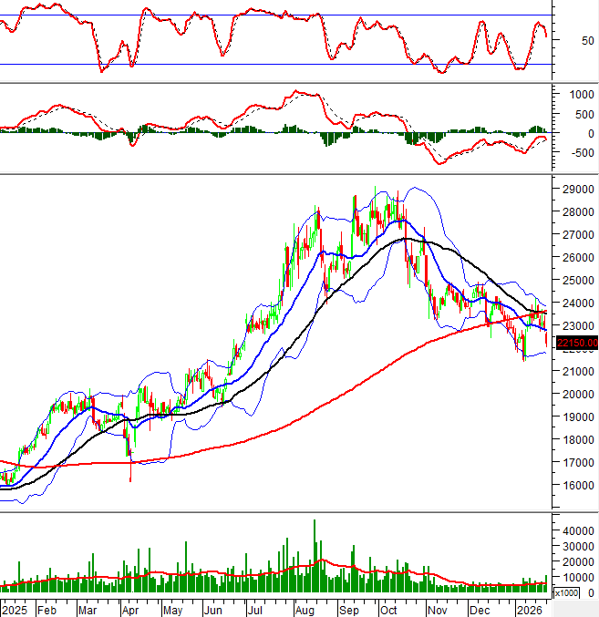 Trong phiên giao dịch sáng ngày 26/01/2026, HNX-Index đã rơi xuống dưới đường Middle của Bollinger Bands.